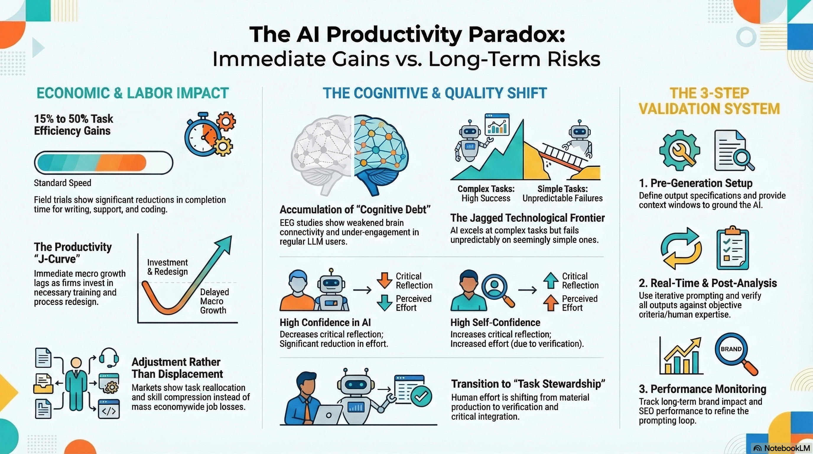 The infographic’s 3-Step Validation System offers a practical governance structure that addresses both the quality risks and the cognitive risks simultaneously:
